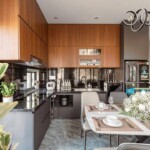 Khác với những mẫu nhà truyền thống, với nhà anh Phú, không gian đầu tiên chúng ta bắt gặp khi bước vào nhà là không gian bếp và bàn ăn. Một điểm đặc biệt nữa trong không gian này đó chính là khối cầu thang kết hợp bồn hoa- điểm nhấn xanh giữa không gian nhẹ nhàng, ấm cúng của gian bếp