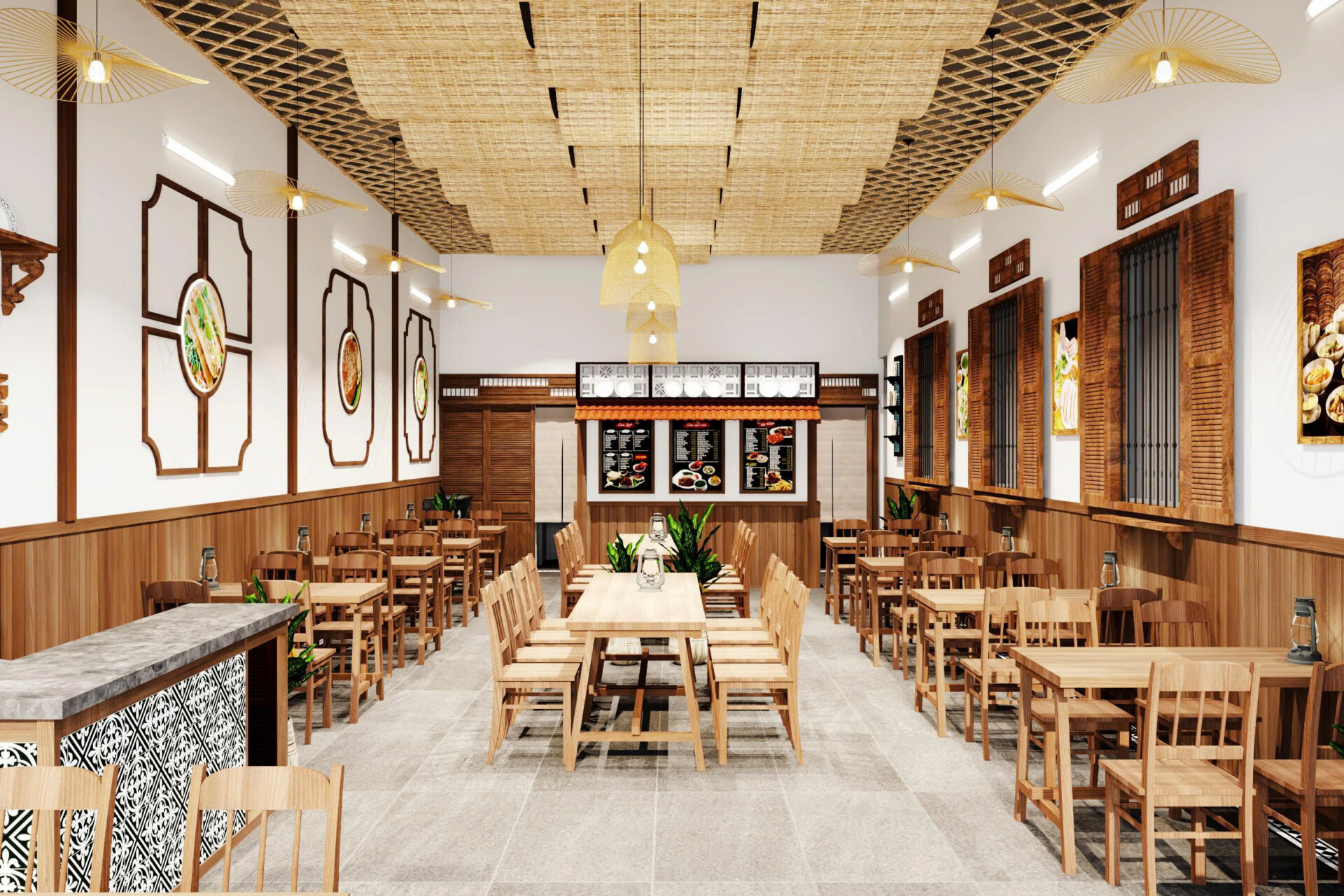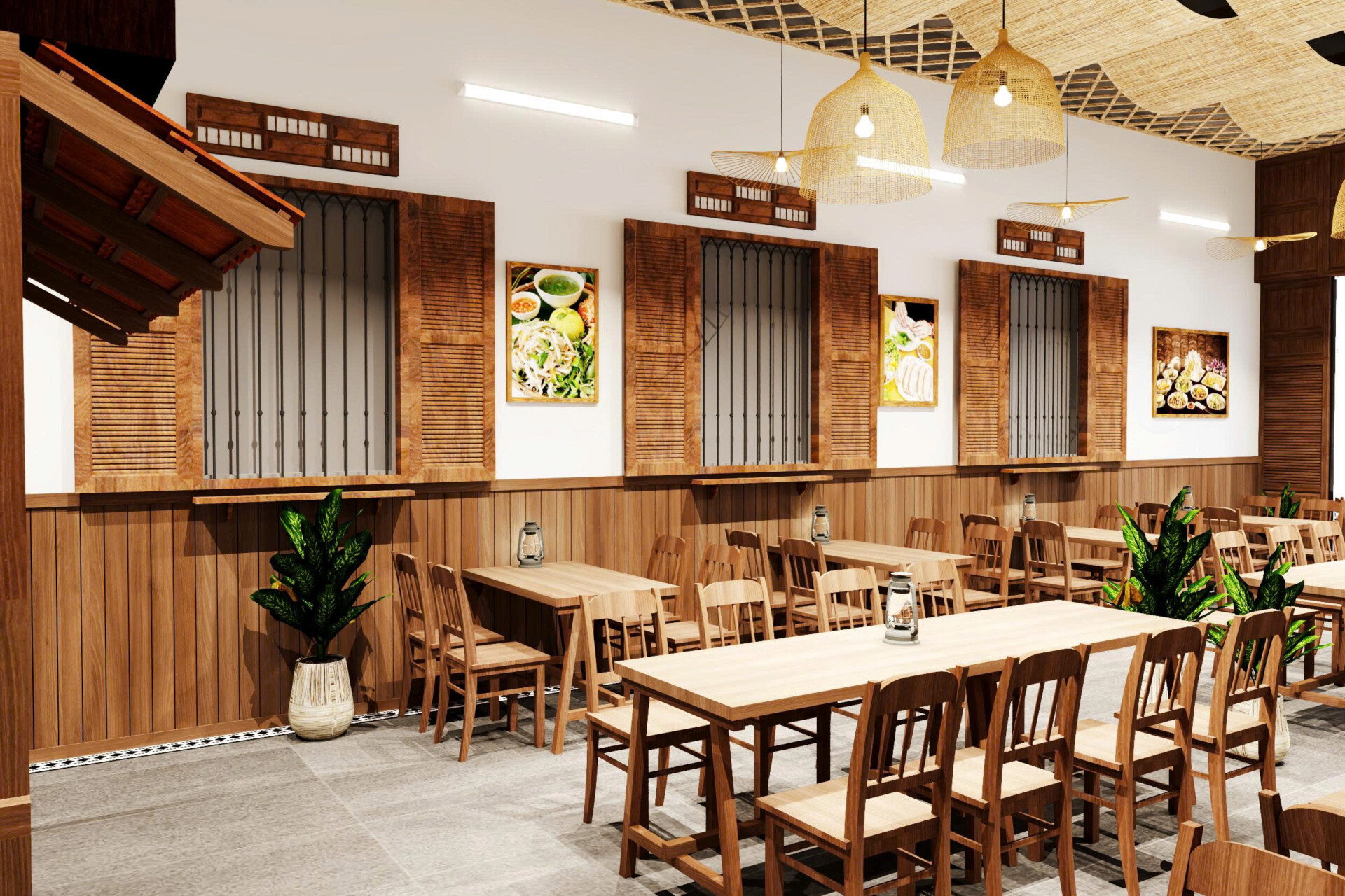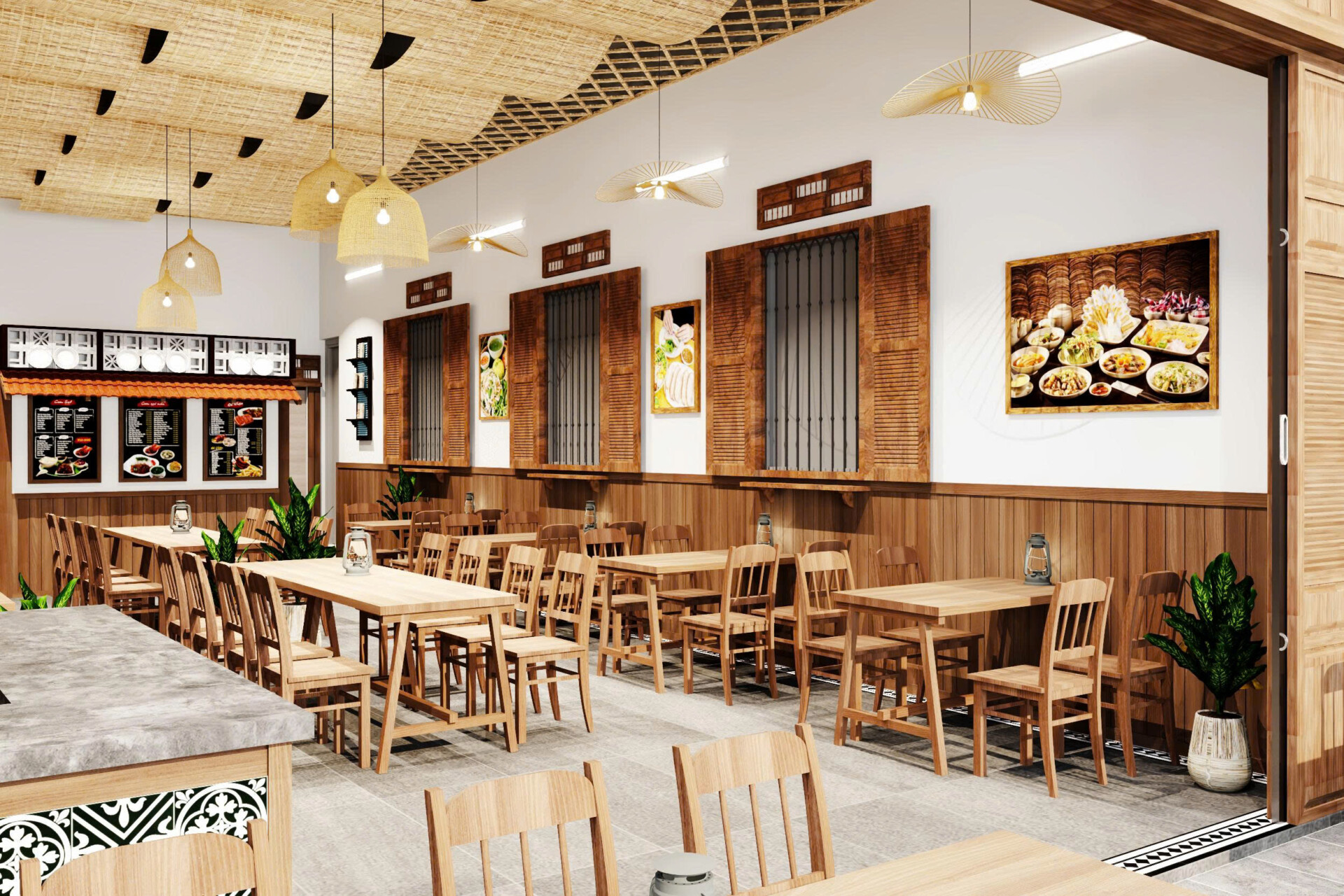 Dự án hướng đến phong cách mở, tận dụng tối đa ánh sáng tự nhiên và sự kết nối giữa không gian bên trong và bên ngoài. Mặt tiền được thiết kế với hệ cửa mở rộng, tạo cảm giác thông thoáng và dễ dàng thu hút khách từ bên ngoài. Tre trúc và gỗ là hai vật liệu chủ đạo, giúp tổng thể quán ăn mang đậm chất truyền thống nhưng vẫn phù hợp với xu hướng hiện đại.