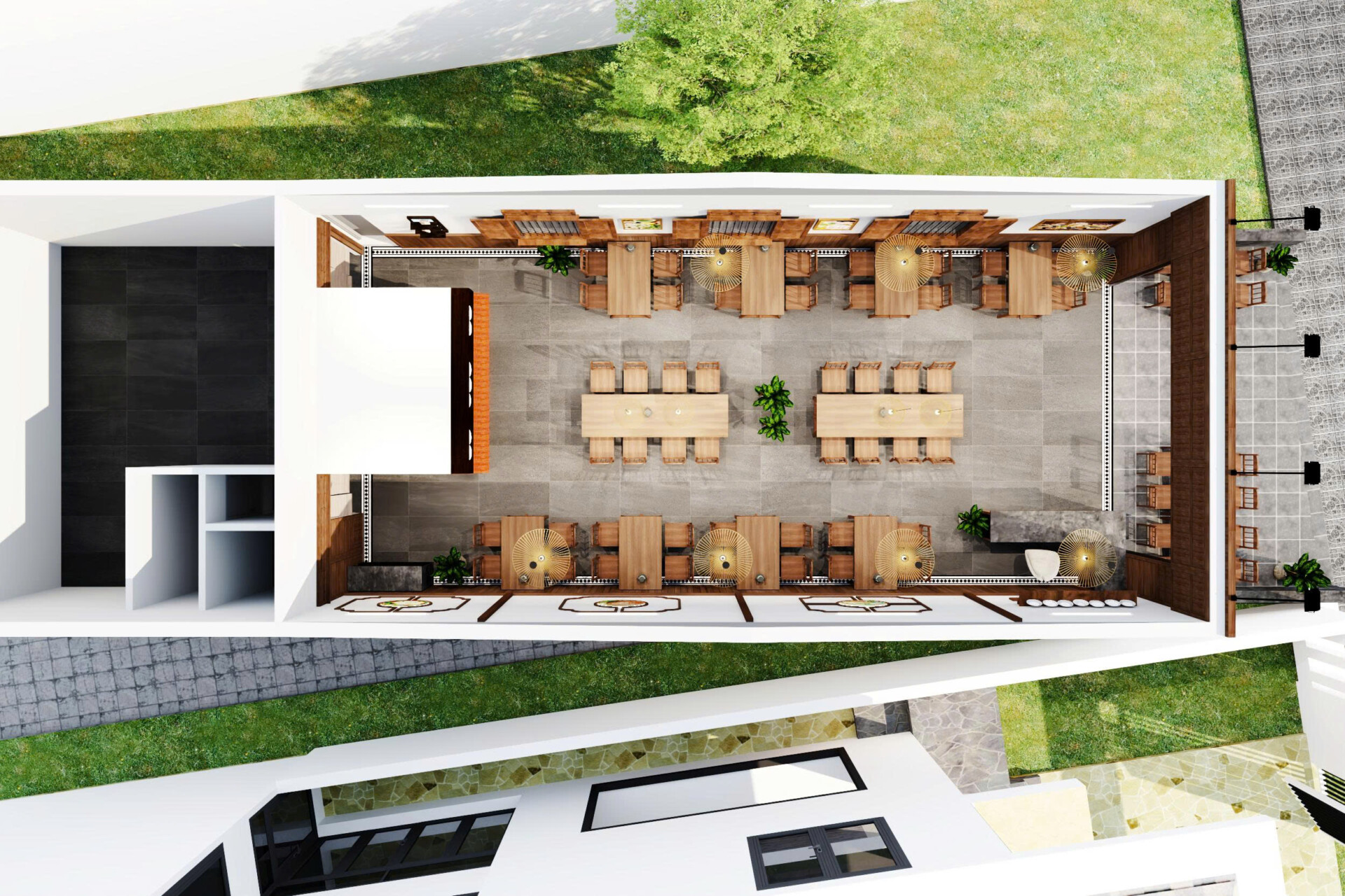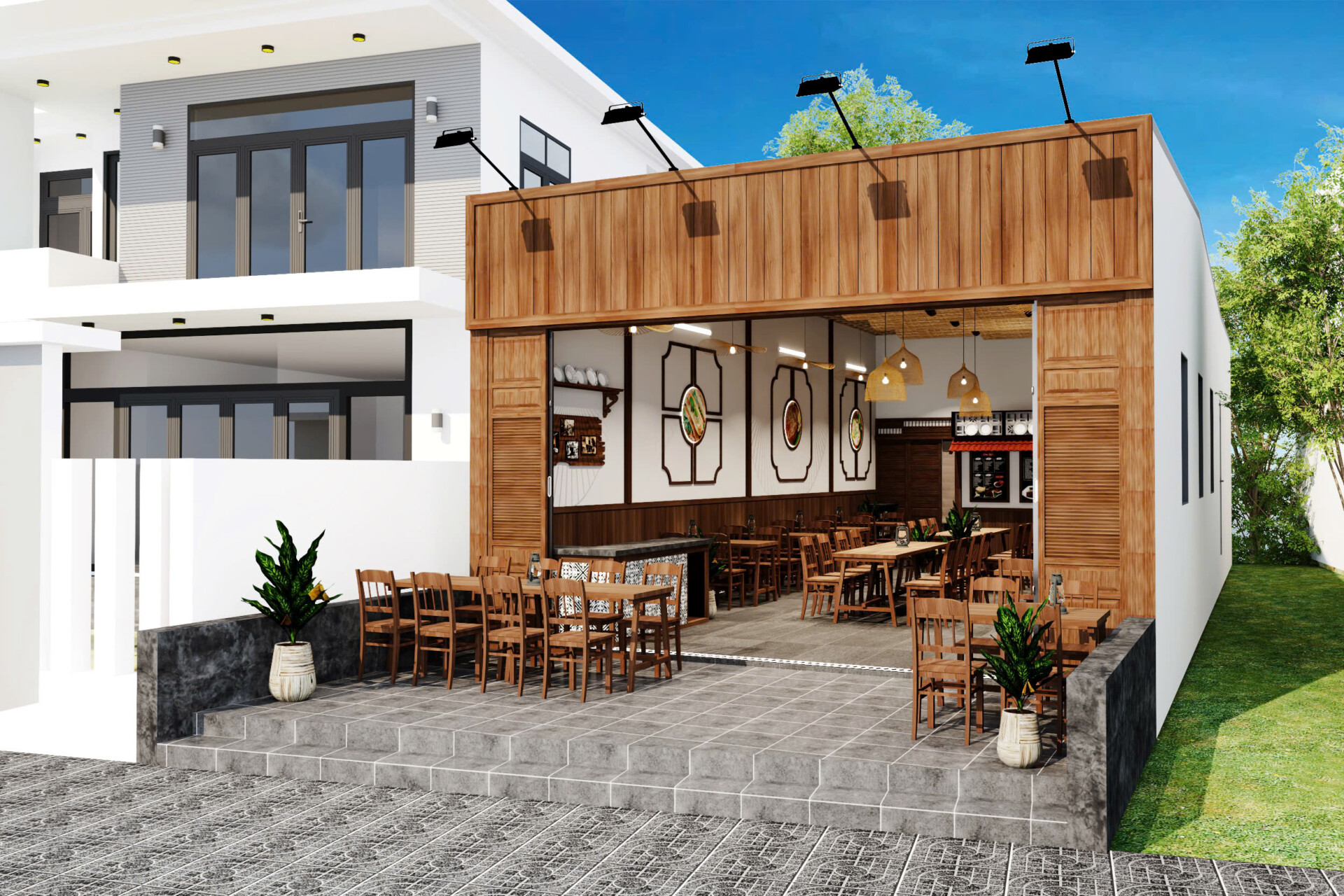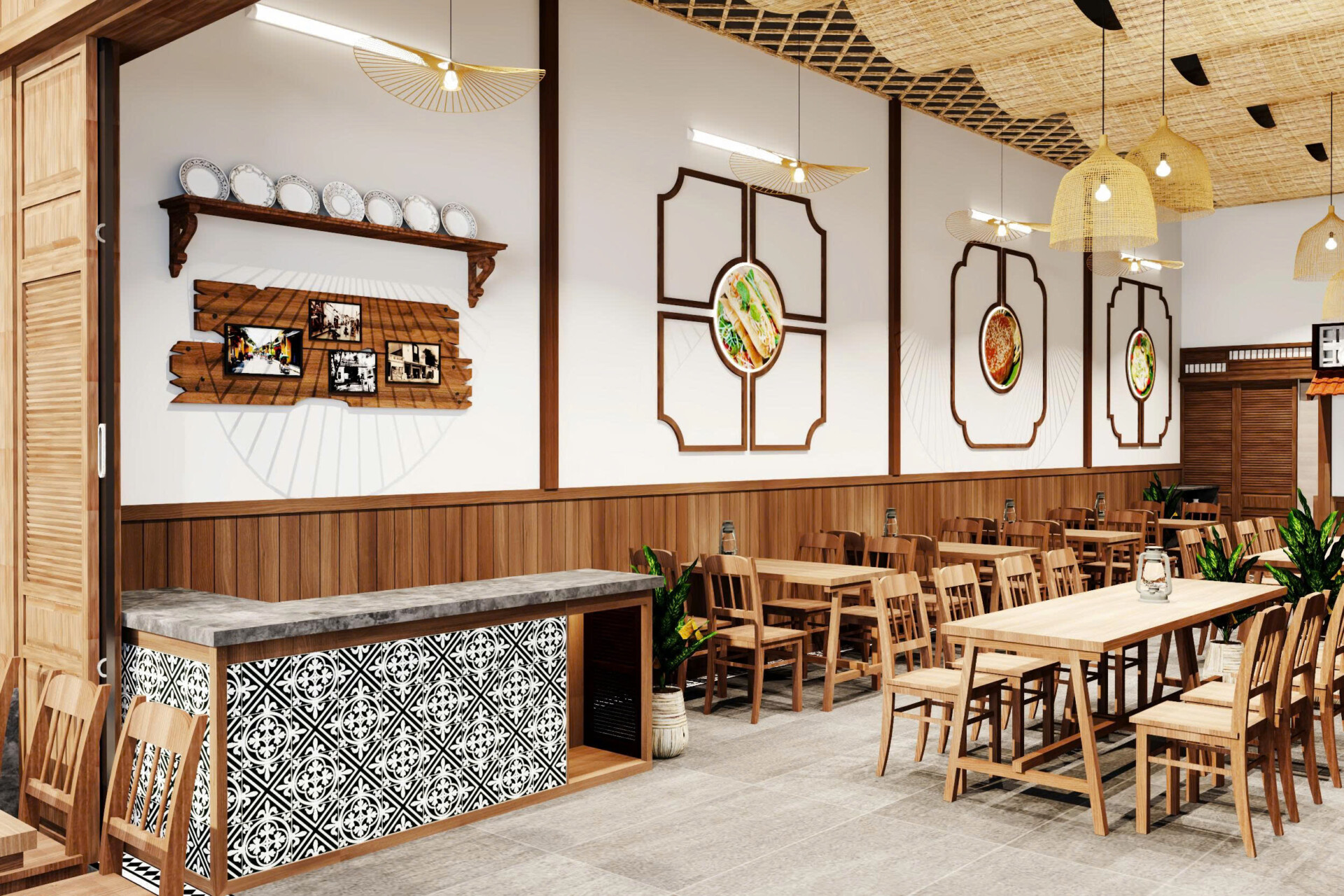 Dự án hướng đến phong cách mở, tận dụng tối đa ánh sáng tự nhiên và sự kết nối giữa không gian bên trong và bên ngoài. Mặt tiền được thiết kế với hệ cửa mở rộng, tạo cảm giác thông thoáng và dễ dàng thu hút khách từ bên ngoài. Tre trúc và gỗ là hai vật liệu chủ đạo, giúp tổng thể quán ăn mang đậm chất truyền thống nhưng vẫn phù hợp với xu hướng hiện đại.