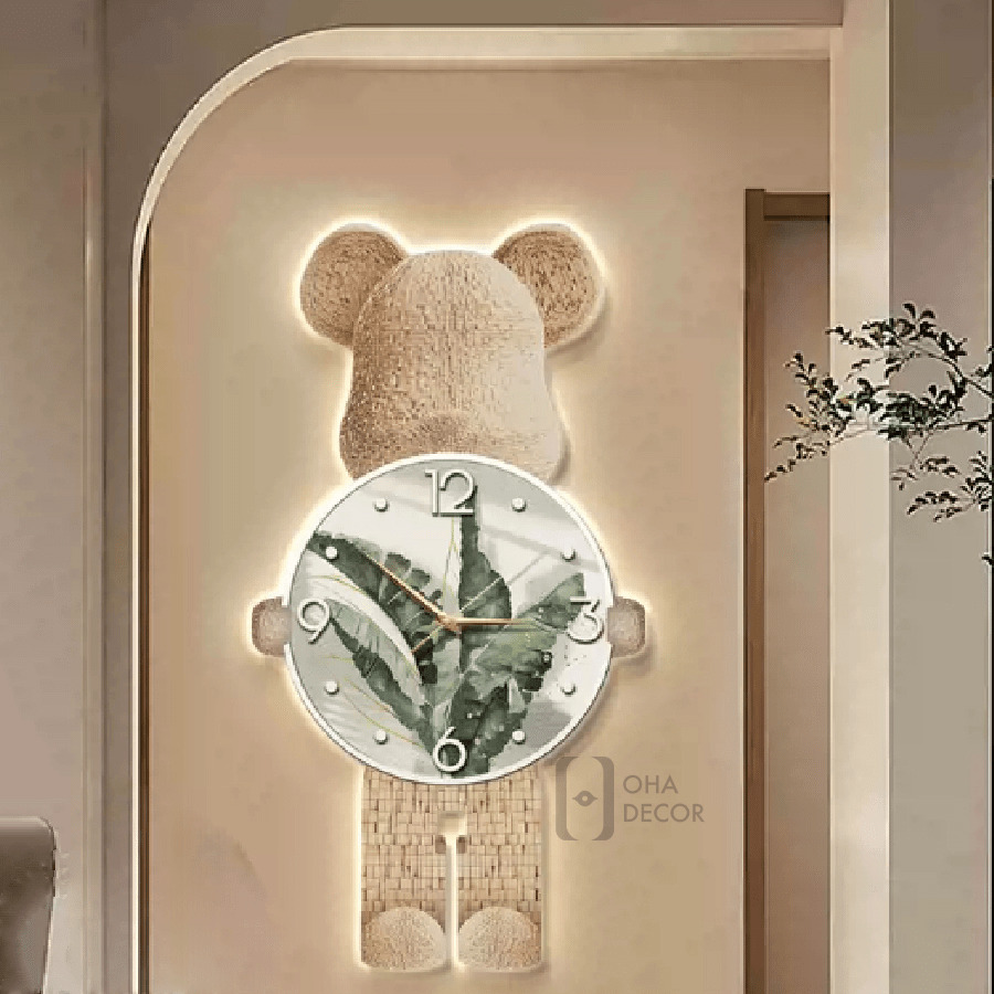 Tranh Treo Tường Đồng Hồ Đèn 3D LED Tráng Gương Cao Cấp Gấu Bearbrick Trang Trí Phòng Khách, Phòng Ngủ OHA Decor
